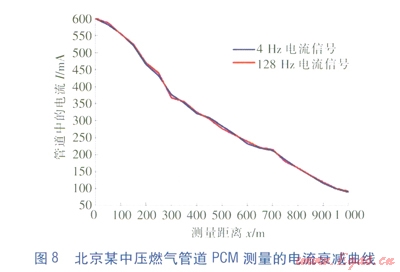 從圖8可以看出,在野外環(huán)境中,受到干擾較小,4Hz128Hz的電流衰減曲線基本一致,沒有出現(xiàn)較大波動的情況。利用評估軟件對燃?xì)夤艿赖姆栏瘜用骐娮杪蔬M行計算,4Hz電流信號的防腐層平均面電阻率的計算結(jié)果為8264W·m2;128Hz電流信號的防腐層面電阻率的計算結(jié)果為8697W·m2。對照組的實驗結(jié)果表明,在干擾較小的情況下,4Hz電流信號和128Hz電流信號的檢測結(jié)果差異不大。