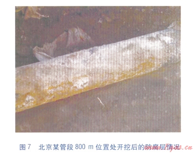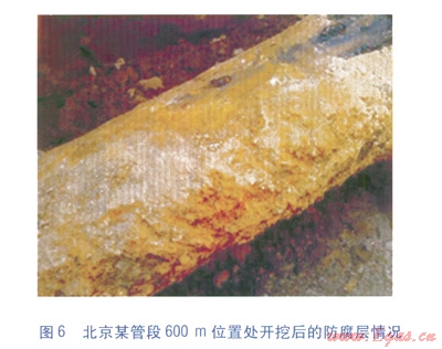 128Hz電流測量信號的結(jié)果中(見圖4),在600m800m左右的位置上,出現(xiàn)了防腐層質(zhì)量較差的情況,對兩處位置進行定位和開挖,開挖坑內(nèi)防腐層的情況分別見圖6、7。