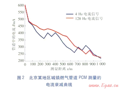 下面以北京某地區(qū)的燃?xì)夤艿罏槔M行分析。該段管道全長約1000m,防腐層的類型為石油瀝青,管道規(guī)格為DNl50mm。該管段所處環(huán)境比較復(fù)雜,有小區(qū)、道路等,受干擾較為嚴(yán)重。PCM檢測時,信號發(fā)射機發(fā)射的電流為600mA,信號類型為ELCD。在對防腐層進行檢測時,分別選擇了4Hz電流信號和128Hz電流信號的檢測結(jié)果進行比對,該段管道PCM測量的電流衰減曲線見圖2。