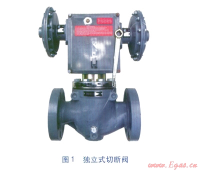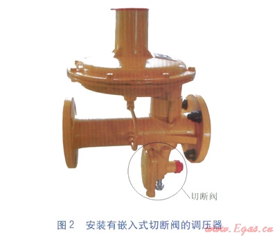 城鎮(zhèn)燃?xì)庾粤κ角袛嚅y根據(jù)組裝方式不同,主要分為兩大類:一種是作為獨立的切斷裝置,安裝于調(diào)壓器之前,稱為獨立式切斷閥,見圖1;另外一種是集成于調(diào)壓器上,作為調(diào)壓器的輔助構(gòu)件之一,稱為嵌入式切斷閥,見圖2。