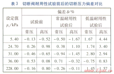 切斷閥在使用過程中,實際的切斷壓力值與切斷壓力設(shè)定值相比會有一定的偏差,常溫耐用性試驗后的偏差會稍高于耐用性試驗前的偏差,低溫耐用性試驗后的偏差更大,可見低溫條件下的頻繁切斷會導(dǎo)致切斷閥的實際切斷壓力漂移得更為嚴(yán)重。