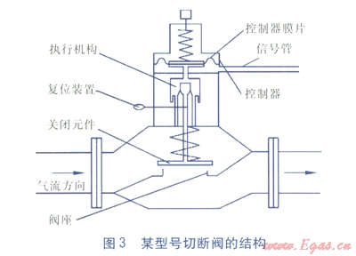 燃?xì)馇袛嚅y作為城鎮(zhèn)燃?xì)廨斉湎到y(tǒng)中重要的安全設(shè)備,廣泛地應(yīng)用于燃?xì)廨斉鋸S站、各級調(diào)壓站和調(diào)壓箱內(nèi)。燃?xì)馇袛嚅y安裝于調(diào)壓器的上游管道上,其主要功能是,當(dāng)調(diào)壓器出現(xiàn)工作異常情況而導(dǎo)致出口壓力過高或過低時,及時切斷燃?xì)馔?span lang="EN-US">(超壓切斷或欠壓切斷),確保下游用戶和設(shè)備的用氣安全[1-2]。城鎮(zhèn)燃?xì)馇袛嚅y一旦關(guān)閉后,一般需要人工復(fù)位,不能自動開啟[3]。切斷閥的質(zhì)量和性能直接影響到城鎮(zhèn)燃?xì)廨斉湎到y(tǒng)的安全可靠性。
