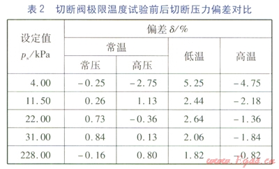 極限溫度條件會導(dǎo)致切斷閥的實際切斷壓力值與切斷壓力設(shè)定值之間產(chǎn)生一定的偏差,且比常溫條件下的偏差更大。因此廠家在進(jìn)行產(chǎn)品研發(fā)時,要充分考慮極限溫度條件對切斷閥切斷性能的影響。