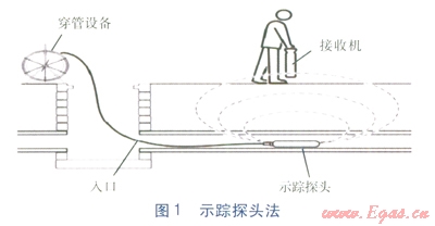 示蹤探頭法(見圖l)主要用于探查有出入口的非金屬管道。該方法是將能發(fā)射電磁信號(hào)的示蹤探頭通過穿管設(shè)備,從管道開口處穿入拉管管道內(nèi),在地面上用接收機(jī)接收示蹤探頭發(fā)射的信號(hào),對(duì)拉管管道進(jìn)行準(zhǔn)確定位[5]。只要具備良好的接地條件,此方法就能有效避免常規(guī)示蹤線法探測(cè)存在的弊端,不易受周邊管線、介質(zhì)干擾,能較大程度保證拉管管道的探測(cè)精度。采用該方法具有探測(cè)結(jié)果能準(zhǔn)確提供拉管管道的三維空間位置數(shù)據(jù)及探測(cè)數(shù)據(jù)可作為拉管管道施工驗(yàn)收依據(jù)兩點(diǎn)意義。