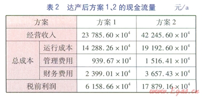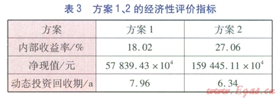本文采用內(nèi)部收益率(稅前)、凈現(xiàn)值(稅前)、動(dòng)態(tài)投資回收期(稅前)作為方案經(jīng)濟(jì)性評(píng)價(jià)指標(biāo)。內(nèi)部收益率的經(jīng)濟(jì)含義是項(xiàng)目在其壽命期內(nèi)未回收資金的預(yù)計(jì)收益率,項(xiàng)目投入運(yùn)營(yíng)后,投資額將通過(guò)每年所產(chǎn)生凈效益的形式逐步得到回收。已回收部分將用于再投資,未回收部分待繼續(xù)回收,內(nèi)部收益率就是指未回收部分的收益率,因此稱為內(nèi)部收益率。凈現(xiàn)值的經(jīng)濟(jì)含義是項(xiàng)目在其壽命期內(nèi)預(yù)計(jì)創(chuàng)造的全部?jī)粜б?。?nèi)部收益率、凈現(xiàn)值都是反映項(xiàng)目贏利能力的指標(biāo),前者體現(xiàn)的是相對(duì)贏利能力,后者體現(xiàn)的是絕對(duì)贏利能力。內(nèi)部收益率、凈現(xiàn)值越大,項(xiàng)目贏利能力越強(qiáng)。動(dòng)態(tài)回收期越短,說(shuō)明項(xiàng)目收回投資額的時(shí)間越短。方案12的經(jīng)濟(jì)性評(píng)價(jià)指標(biāo)見(jiàn)表3。由表3可知,方案2的內(nèi)部收益率、凈現(xiàn)值均高于方案l,且方案2的動(dòng)態(tài)投資回收期短于方案l,這說(shuō)明方案2的經(jīng)濟(jì)性優(yōu)于方案l。
