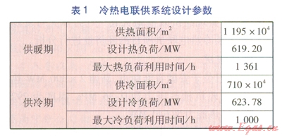 對(duì)于供冷對(duì)象,考慮到居住建筑同時(shí)利用率低、運(yùn)行管理及收費(fèi)復(fù)雜等情況,該冷熱電聯(lián)供系統(tǒng)的供冷對(duì)象主要考慮辦公、商場(chǎng)等公共建筑,不考慮居住建筑。供熱對(duì)象涉及居住建筑及公共建筑,居住建筑供熱面積為627×104m2,公共建筑供熱面積為568×104m2。冷熱電聯(lián)供系統(tǒng)設(shè)計(jì)參數(shù)見(jiàn)表l。由表1可知,該冷熱電聯(lián)供系統(tǒng)設(shè)計(jì)冷熱負(fù)荷比較接近,這對(duì)于熱電機(jī)組的高效運(yùn)行十分有利。