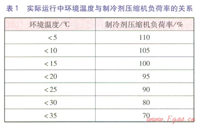 針對燃氣輪機高溫情況下易跳車的故障表現(xiàn),該工廠擬采用降低空氣入口溫度的方法解決跳車問題。其方案可行性研究報告認為,工廠夏季平均環(huán)境溫度高達30℃,相對濕度為70%~80%,溫度高、濕度大是造成燃氣輪機輸出功率不足的主要原因。燃氣輪機額定輸出功率為7.65MW,制冷劑壓縮機設(shè)計輸入功率為6.13MW,理論上燃氣輪機應(yīng)能滿足制冷劑壓縮機滿負荷下的功率要求。但在實際運行過程中,按照制冷劑壓縮機功率計算,夏季負荷率最高只能維持在80%左右,相當于燃氣輪機在該環(huán)境溫度下的輸出功率僅有4.9MW左右,遠低于燃氣輪機的額定輸出功率。該廠技術(shù)人員總結(jié)實際運行經(jīng)驗,發(fā)現(xiàn)實際運行中環(huán)境溫度與制冷劑壓縮機負荷率的關(guān)系見表l。