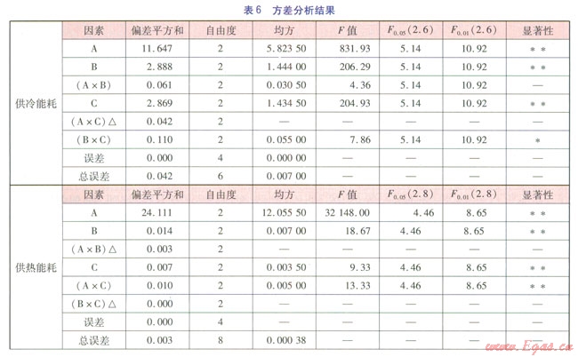 A×C交互作用的偏差平方和最小,作為誤差處理。FA、FB、FC(即A、B、C的F值,其他類似表示意義與此相同)均大于F0.01(2.6),即A、B、C三個因素對供冷能耗的影響為高度顯著。F0.05(2.6)<FB×C<F0.01(2.6),即B×C交互作用顯著;FA×C<F0.05(2.6),即A×C交互作用不顯著。