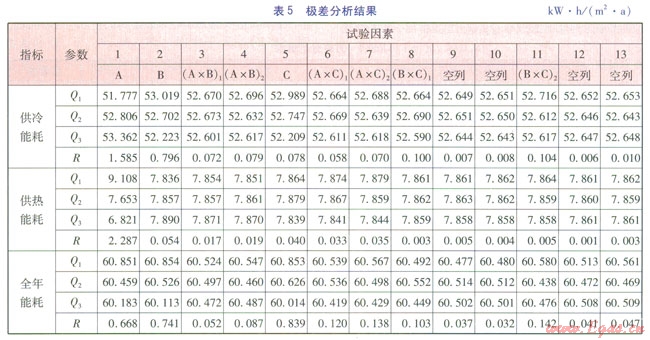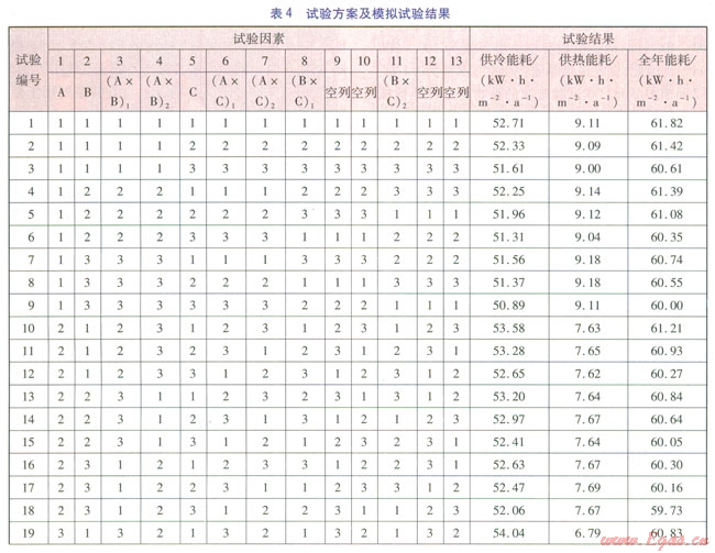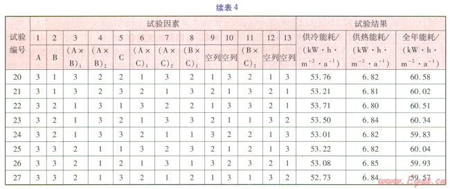 正交試驗的指標有供冷能耗、供熱能耗和全年能耗,其中全年能耗為供冷能耗和供熱能耗之和。正交試驗模擬結(jié)果見表4。
