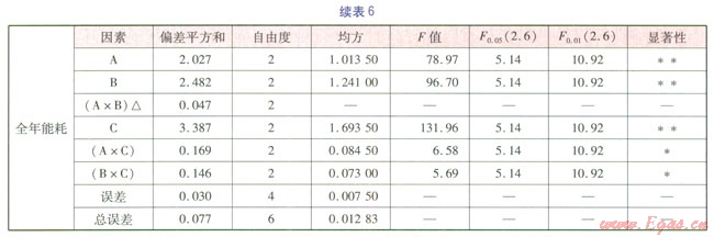 A×B交互作用的偏差平方和小于誤差偏差平方和的2倍,把A×B作為誤差處理。FA、FB、FC均大于F0.01(2.6),即A、B、C三個因素對全年能耗的影響為高度顯著。F0.05(2.6)<FB×C<F0.01(2.6),F0.05(2.6)<FB×C<F0.01(2.6),即A×C、B×C交互作用對全年能耗的影響顯著。