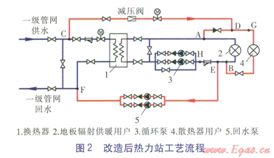 熱力站一級(jí)側(cè)供、回水溫度為100、60℃,改造前熱力站二級(jí)側(cè)(僅有地板輻射供暖用戶)供、回水溫度為50、40℃,擬增加的散熱器用戶供回水溫度為80、60℃。改造前后熱力站工藝流程分別見圖1、2。由圖1、2可知,改造后,散熱器用戶一部分供水由換熱器二級(jí)側(cè)供水管道引出,另一部分供水由換熱器一級(jí)側(cè)供水管道引出。由一級(jí)側(cè)供水管道引出的熱水經(jīng)減壓閥、電動(dòng)調(diào)節(jié)閥后,與由二級(jí)側(cè)供水管道引出的熱水混合,作為散熱器用戶的供水。散熱器用戶回水與地板輻射供暖用戶回水混合后,一部分回到換熱器二級(jí)側(cè)回水管道,另一部分回到一級(jí)側(cè)回水管道。改造后二級(jí)側(cè)補(bǔ)水可由一級(jí)側(cè)補(bǔ)充,因此二級(jí)側(cè)原有補(bǔ)水裝置(補(bǔ)水泵、水處理裝置等)可取消?;厮昧髁颗c管道CD流量一致。經(jīng)校核,新增散熱器用戶的流量未超出循環(huán)泵的裕量,不影響地板輻射用戶流量。