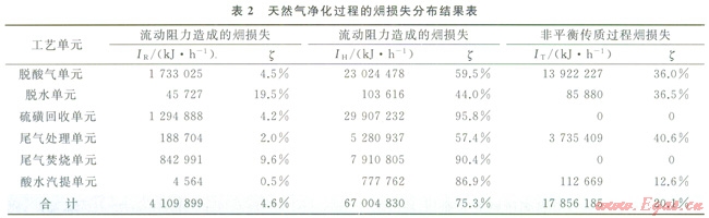 由天然氣凈化過(guò)程能量結(jié)果模型可知,天然氣凈化裝置損失可分為3類(lèi):由流動(dòng)阻力造成的損失(IR)、換熱過(guò)程損失(IH)和非平衡傳質(zhì)過(guò)程損失(IT)。表2為天然氣凈化過(guò)程損失分布結(jié)果。