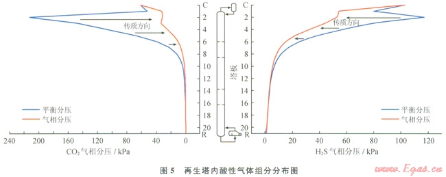 在考慮解析塔分析的同時(shí),必須兼顧解析塔內(nèi)酸氣解析效果,圖5所示為再生塔內(nèi)酸性氣體組分分布情況。