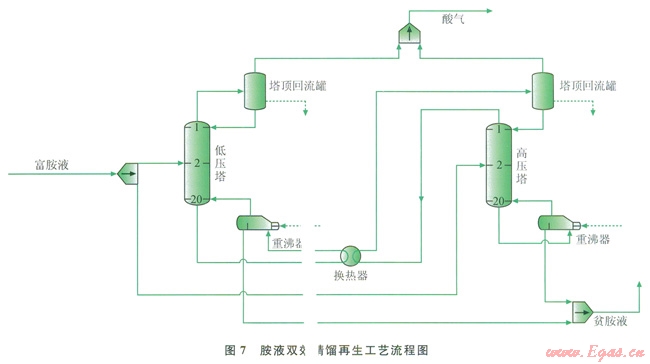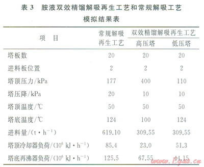 從損失分布圖可以發(fā)現(xiàn),由于雙效精餾過(guò)程將再生塔的外部損失合理利用,不僅大大降低了胺液解吸再生過(guò)程的熱量消耗,而且也降低了能損失,提高了整個(gè)胺液解吸再生過(guò)程的效率。將雙效精餾過(guò)程看成一個(gè)整體,其胺液解吸再生過(guò)程的效率為12.7%,較之于傳統(tǒng)流程單塔解吸過(guò)l2.7%,較之于傳統(tǒng)流程單塔解吸過(guò)程,效率提高了約27.0%。