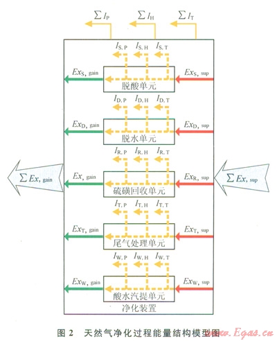 依據(jù)天然氣凈化過(guò)程能分析所確定的凈化過(guò)程3種炯損失,并借鑒“白箱”分析模型將各天然氣凈化操作單元視為一個(gè)“白箱”,每個(gè)“白箱”內(nèi)的損失為動(dòng)量損失、傳熱損失和傳質(zhì)損失3部分,從而建立了如圖2所示的天然氣凈化過(guò)程能量結(jié)構(gòu)模型,圖2中∑Exsup和∑Exgain為外界供人凈化過(guò)程的能及產(chǎn)品凈化天然氣物流獲得的能;∑Exs,sup和∑Exs,gain為脫酸氣單位供人和獲得的能;∑ExD,sup和∑ExD,gain為脫水單位供人和獲得的能;∑ExR,sup和∑ExR,gain為硫磺回收單位供入和獲得的能;∑ExT,sup和∑ExT,gain為尾氣處理單位供人和獲得的能;∑ExW,sup和∑Exw,gain為酸水汽提單位供入和獲得的能;∑Ip、∑IH、∑IT,分別為凈化過(guò)程產(chǎn)生的動(dòng)量損失、傳熱損失和傳質(zhì)損失;IS,P、IS,H、IS,T分別為脫酸氣單位產(chǎn)生的動(dòng)量損失、傳熱損失和傳質(zhì)損失;ID,P、ID,H、ID,T分別為脫水單位產(chǎn)生的動(dòng)量損失、傳熱損失和傳質(zhì)損失;IR,P、IR,H、IR,T分別為硫磺回收單位產(chǎn)生的動(dòng)量損失、傳熱損失和傳質(zhì)損失;IT,P、IT,H、IT,T分別為尾氣處理單位產(chǎn)生的動(dòng)量損失、傳熱損失和傳質(zhì)損失;IW,P、IW,H、IW,T分別為酸水汽提單位產(chǎn)生的動(dòng)量損失、傳熱損失和傳質(zhì)損失。