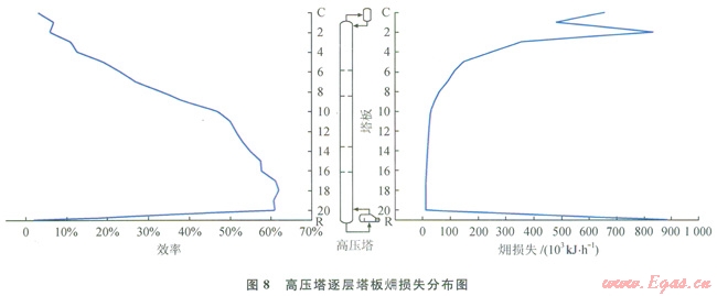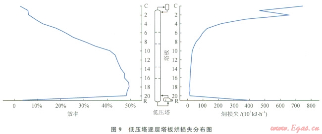 圖8、9為高壓塔和低壓塔逐層塔板損失分布圖。