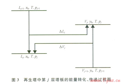 圖3表示再生塔中第j層塔板上能量的傳遞與轉(zhuǎn)換過(guò)程。現(xiàn)以其作為研究對(duì)象,對(duì)該層塔板進(jìn)行分析。