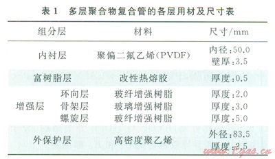多層聚合物復(fù)合管道結(jié)構(gòu)如圖1所示,其中由內(nèi)至外分別為內(nèi)襯層、富樹脂層、增強(qiáng)層和外保護(hù)層,每層具體所用的材質(zhì)及尺寸如表l所示,內(nèi)襯材料由比利時Sovlay公司提供。