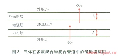 增強(qiáng)層中氣體的滲透壓(p)由內(nèi)襯層透過的氣體量(dQ1)和氣體從外保護(hù)層進(jìn)入空氣中的氣體量(dQ2)間的差額來確定,它們之間的關(guān)系可以表示為: