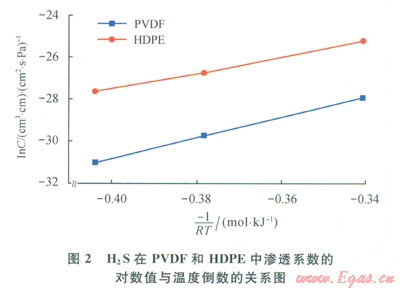1) H2SPVDFHDPE中滲透系數(shù)的對數(shù)值與溫度倒數(shù)呈良好的線性關(guān)系,滲透規(guī)律符合Arrhenius模型關(guān)系: