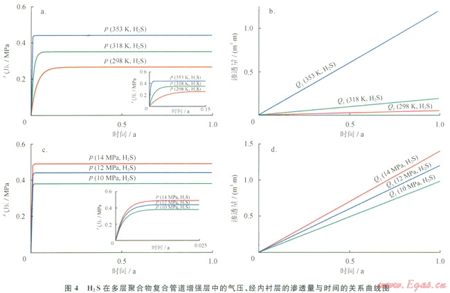 由圖4可知,當(dāng)內(nèi)管氣壓為12MPa時,溫度由298K升高至353K,1a內(nèi)H2S在管道中產(chǎn)生的氣壓由0.265MPa升高到0.44MPa,大約提高了0.66倍。單位長度的氣體滲透量由0.0525m3升高到1.2m3,增大了約22倍。當(dāng)溫度為353K時,管內(nèi)氣壓由10MPa升高至14MPa,1a內(nèi)管道中的H2S氣壓力由0.38MPa升高至0.49MPa,增大了約0.29倍。單位長度的氣體滲透量由0.98m3升高至1.40m3,增大僅0.43倍。由此可見,溫度對H2S滲透行為的影響大于內(nèi)壓引起的影響。