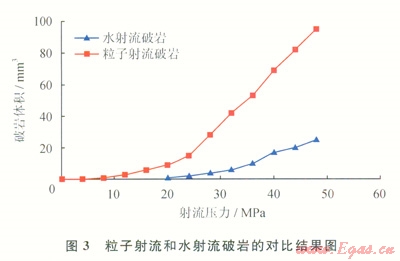 實驗巖性為大理石,鋼粒的直徑為1mm,實驗壓力為0~50MPa。利用水射流的和粒子射流分別沖擊破碎巖石后,在相同的射流壓力下,粒子射流破巖的破巖體積為水射流破巖體積的3~4倍(圖3),而且粒子射流破巖的門限壓力要小于水射流門限壓力的2~3倍。