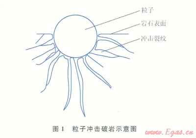 1)高速的粒子沖擊到巖石的表面后,接觸應力繼續(xù)增加時,會在接觸面附近的巖石內部產(chǎn)生剪切應力和拉伸應力,當粒子沖擊產(chǎn)生的拉應力和剪應力大于巖石的抗拉和抗剪強度后,破碎的裂紋開始產(chǎn)生。粒子以100m/s以上的速度沖擊巖石,粒子含量為2%時,粒子沖擊的頻率每分鐘達500萬次。