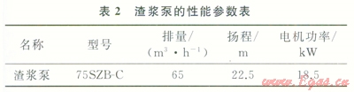 將rp=4.8g/cm3、Vp=6m3/h、rn=1.1g/cm3、C=30%代入公式(5)得到:Q=61m3/h。實際使用的渣漿泵的排量為65m3/h。性能參數(shù)如表2所示。