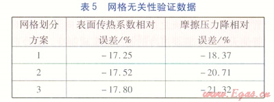 為了考察網(wǎng)格疏密程度對數(shù)值求解的影響以及確定網(wǎng)格劃分方案,本文以AUNAN的一組甲烷過熱氣實驗數(shù)據(jù)[8]165作為依據(jù),采用動態(tài)模擬進行計算,壁面函數(shù)為增強壁面函數(shù),網(wǎng)格無關性驗證數(shù)據(jù)見表5。