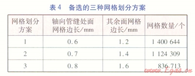 使用ANSYS ICEM CFD軟件對物理模型進行網(wǎng)格劃分,采用非結(jié)構(gòu)化網(wǎng)格,先對面生成網(wǎng)格,進而自適應生成體網(wǎng)格。在整個模型中,纏繞管的軸向管縫寬1.94mm,為最小的幾何尺度,故以此作為面網(wǎng)格的劃分依據(jù),備選的三種網(wǎng)格劃分方案見表4。另外,為了精確計算摩擦壓力降和表面?zhèn)鳠嵯禂?shù),特在三層纏繞管的壁面處設置較細的邊界層,邊界層起步厚度為0.005mm,增長因子為1.2,共計10層邊界層。