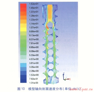 以甲烷在Re=7×104下(對應的質(zhì)量流量為0.0185kg/s)的流動、換熱為例,圖9~11分別是模型軸向通過中間分流孔中心的剖面(以下簡稱軸向剖面)靜壓、速度、溫度分布圖,圖12是加熱管周圍速度分布局部放大圖,圖13是加熱管壁面溫度分布圖,圖14是沿模型高度方向跨度取0.5倍軸向間距(6.97mm)時的流道靜壓變化圖。