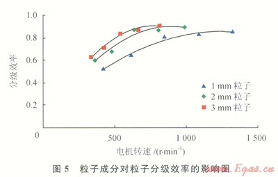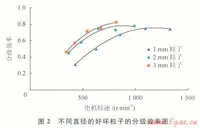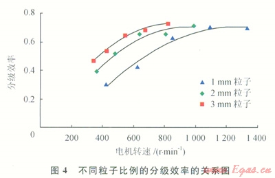 實(shí)驗(yàn)材料仍為直徑分別為1mm2mm、3mm的好壞粒子的混合物,但好壞粒子混合比例變?yōu)?span lang="EN-US">11(體積比),得到分級效率和電機(jī)轉(zhuǎn)速之間的關(guān)系(4)。