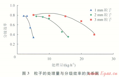 從圖3中可以看出,對于某一直徑的鋼粒子混合物,隨著粒子處理量的增加,分級效率呈現(xiàn)下降趨勢;鋼粒子的直徑越小,其分級效率受處理量的影響越大。分析得出,出現(xiàn)該種情況的原因是大直徑完整粒子與破損粒子的質(zhì)量差異較大,小直徑完整粒子與破損粒子的質(zhì)量差異較小,該分離機(jī)分離好壞粒子的機(jī)理在于質(zhì)量的差異,因此也就出現(xiàn)了分選裝置處理粒子的能力和鋼粒子直徑相關(guān)的現(xiàn)象。
