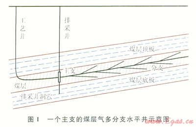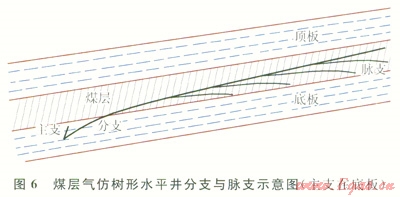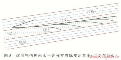 3)在每個(gè)分支上側(cè)鉆若干脈支(一般38個(gè)),脈支在煤層內(nèi),以溝通煤層內(nèi)裂隙為主要目的,不出煤層,長度一般50400m,不求長,但數(shù)量盡可能多,以增大煤層氣解析面積(5)。