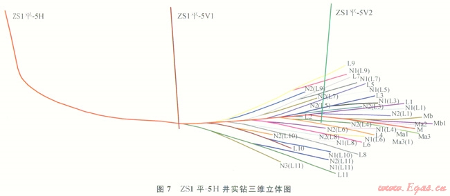 ZSl-5H井是中國石油華北油田公司在山西沁水盆地的第1口煤層氣仿樹形水平井先導(dǎo)試驗(yàn)。由1口工藝井(ZSl-5H)1口排采直井(ZSl-5H)1口監(jiān)測井(ZSl-5H)組成(7),工藝井主支設(shè)置在煤層頂板泥巖中,距煤層頂部保持適當(dāng)距離(一般控制在0.53m),不觸媒;排采井、監(jiān)測井在煤層頂板造洞穴,洞穴底部距離煤層1m,直徑0.6m,高度6m