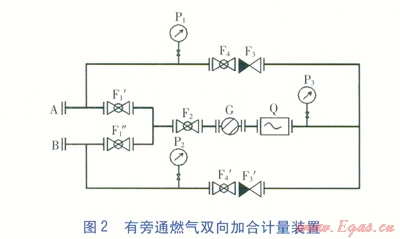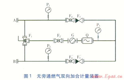 同理,可實(shí)現(xiàn)燃?xì)鈴?span lang="EN-US">B端單向流向A端并計(jì)量的目標(biāo)。當(dāng)過(guò)濾器G、流量計(jì)Q有問(wèn)題或需清洗維修時(shí),可打開旁通球閥F1¢讓燃?xì)馔ㄟ^(guò),以保證加合計(jì)量裝置燃?xì)鈶?yīng)急流動(dòng)的連續(xù)性。