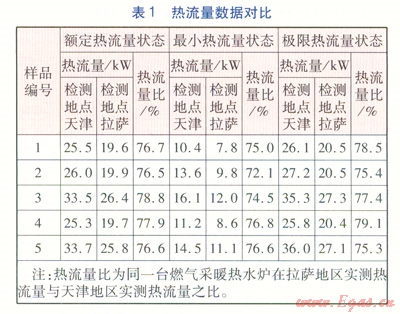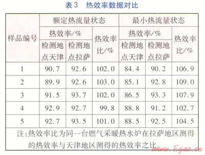 表3列出了5臺樣機分別在拉薩地區(qū)及天津地區(qū)測得的額定熱流量與最小熱流量狀態(tài)的熱效率對比數據。