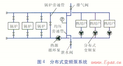 隨著我國供熱行業(yè)節(jié)能意識的不斷增強,分布式變頻泵系統(tǒng)在供熱領(lǐng)域的應(yīng)用越來越廣泛。分布式變頻泵系統(tǒng)的熱源循環(huán)泵只需要克服熱源內(nèi)部阻力,大大減小了熱源循環(huán)泵的能耗。分布式變頻泵承擔(dān)熱用戶(熱力站)的流量,克服熱用戶及管網(wǎng)阻力。與傳統(tǒng)動力集中式系統(tǒng)相比,降低了近端熱用戶節(jié)流富裕壓頭造成的能量損失。因此,理論上分布式變頻泵系統(tǒng)沒有多余的能耗,比傳統(tǒng)動力集中式系統(tǒng)節(jié)能。分布式變頻泵系統(tǒng)見圖4。