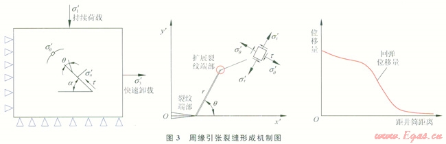 在水力壓裂過(guò)程中快速降低排量、甚至停泵,或瞬時(shí)卸載放噴,都可形成近乎垂直于徑向裂縫的周緣引張裂縫。這些壓裂方式可造成井筒內(nèi)快速卸壓,流體帶動(dòng)煤巖體向井筒方向徑向位移,位移量白鉆孔壁面向外逐漸減小。由于煤巖體中結(jié)構(gòu)弱面兩側(cè)位移量不同,將產(chǎn)生拉應(yīng)力,當(dāng)拉應(yīng)力超過(guò)巖體抗拉強(qiáng)度時(shí),裂縫開(kāi)始萌生擴(kuò)展,形成周緣引張裂縫[20-21](圖3)。