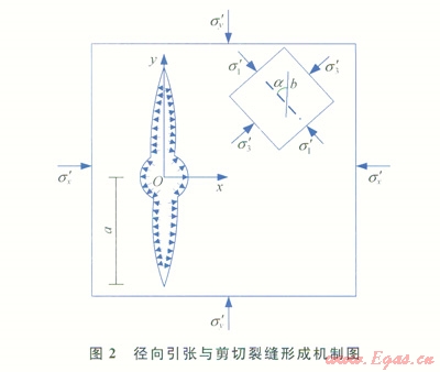 當(dāng)KI>KIC(KIC為煤巖體的張性裂縫斷裂韌度)時(shí),裂縫開(kāi)始向前擴(kuò)展,且沿著最大主應(yīng)力方向延伸、最小主應(yīng)力方向張開(kāi),任何壓裂方式均可形成此類裂縫(圖2)。