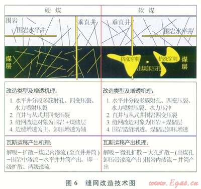 圍巖抽采層—煤儲(chǔ)層縫網(wǎng)改造技術(shù)適合于地面煤層氣開(kāi)發(fā)和井下瓦斯抽采,是一種相對(duì)普適性技術(shù)。其核心是根據(jù)煤巖體結(jié)構(gòu)和力學(xué)性質(zhì),針對(duì)不同的井型采用不同的水力壓裂工藝,最大限度地形成多級(jí)、多類裂縫體系,達(dá)到快速抽采瓦斯的目的。對(duì)于硬煤儲(chǔ)層強(qiáng)化的是圍巖和煤儲(chǔ)層,瓦斯以一級(jí)擴(kuò)散、兩級(jí)滲流方式產(chǎn)出;對(duì)于軟煤儲(chǔ)層強(qiáng)化的是圍巖,煤層不能被強(qiáng)化,只能形成擠脹和穿刺,瓦斯以兩級(jí)擴(kuò)散、一級(jí)滲流方式產(chǎn)出[12](圖6)。但軟煤可以通過(guò)水力壓沖出煤卸壓實(shí)現(xiàn),其機(jī)理另文探討。圍巖煤儲(chǔ)層縫網(wǎng)改造可通過(guò)下述技術(shù)途徑實(shí)現(xiàn)。