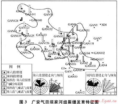 廣安氣田的須六段與須四段儲(chǔ)層總體上裂縫比較發(fā)育,在成像測(cè)井圖上[11],整個(gè)廣安構(gòu)造共有13口井發(fā)育裂縫(圖3),須四段與須六段的裂縫發(fā)育特征相似,裂縫走向主要有北西和北東向2組,中低傾角,發(fā)育井位多數(shù)重合,反映其可能在同一應(yīng)力場(chǎng)下形成。其中須六段裂縫主要發(fā)育在下亞段,共有9口井測(cè)井時(shí)發(fā)現(xiàn)裂縫,以低角度縫為主,部分發(fā)育水平縫和高角度縫,但氣藏分布范圍內(nèi)只有2口井(廣安105和廣安107井)發(fā)育裂縫,共發(fā)現(xiàn)5條張開裂縫,其余裂縫發(fā)育井均不在探明儲(chǔ)量范圍內(nèi)。因此須六段氣藏的主要儲(chǔ)集空間是孔隙,裂縫不是影響產(chǎn)能的主要因素。