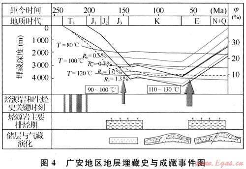首先,根據(jù)廣安地區(qū)的埋藏與生烴史演化,晚侏羅世至早白堊世,地層溫度達(dá)到100~120℃,Ro達(dá)到了1.0%~1.3%,須家河組煤系源巖處于最大生烴期,并發(fā)生了排烴。但是,以煤系為主的烴源巖具有較強(qiáng)的吸附烴能力,吸附狀態(tài)的甲烷占55.83%~95.63%,成為甲烷在煤層中的主要儲(chǔ)存形式。等溫吸附實(shí)驗(yàn)表明,當(dāng)?shù)貙訅毫档蜁r(shí)會(huì)有大量煤層氣發(fā)生脫吸附作用,成為游離氣,通過(guò)煤層割理或裂縫系統(tǒng)進(jìn)入儲(chǔ)集層[15~16]。因此,在地層埋藏大量生烴過(guò)程中,烴源巖并沒(méi)有發(fā)生完全排烴,而是有很多烴類被吸附在煤系地層中,在后期的抬升降溫過(guò)程中發(fā)生大量排烴。