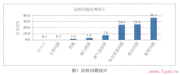 北京市燃?xì)饧瘓F(tuán)從20075月開始進(jìn)行第一期全面巡檢,每期持續(xù)l8個(gè)月,至今已進(jìn)行2.5期巡檢,居民戶內(nèi)安全巡檢內(nèi)容包括:戶內(nèi)燃?xì)夤艿篮蛻魞?nèi)燃?xì)庠O(shè)備的安裝情況是否符合規(guī)范、外觀狀況如何、設(shè)備是否正常、是否有泄漏等。如果發(fā)現(xiàn)異常,能現(xiàn)場維修事項(xiàng)進(jìn)行維修,不能現(xiàn)場維修事項(xiàng)實(shí)施維修工作程序,或者啟動(dòng)緊急搶修程序,或者向用戶發(fā)放“居民用戶巡檢告知單”。本文取第二期(200812月至20104)安全巡檢數(shù)據(jù)進(jìn)行分析。第二期巡檢入戶率約為53.31%,其問題統(tǒng)計(jì)1如圖l所示。