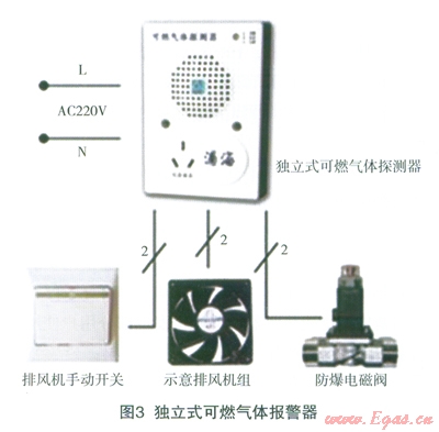 單一報(bào)警功能的報(bào)警器:它能在傳感器周圍燃?xì)鉂舛冗_(dá)到一定數(shù)值時(shí)嗚叫或者發(fā)光報(bào)警,提示家庭用戶及時(shí)采取措施。這種報(bào)警器的特點(diǎn)是價(jià)格較低,安裝簡便,無需改造燃?xì)庀到y(tǒng),因此適用于老舊小區(qū)。另一類為帶信號(hào)輸出功能的報(bào)警器,如圖3所示。這種報(bào)警器可以驅(qū)動(dòng)電磁閥在報(bào)警的同時(shí)及時(shí)切斷燃?xì)馔ǖ溃蛘呖刂婆棚L(fēng)扇、抽油炯機(jī)強(qiáng)制排風(fēng),但其安裝相對復(fù)雜。