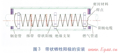 不可避免使用套管時(shí),可在套管內(nèi)部采取局部的陰極保護(hù)也是一種很有效的辦法。具體做法是:在套管內(nèi)的主管道上纏繞鎂陽(yáng)極帶或鋅陽(yáng)極帶或安裝鐲式陽(yáng)極[4]。當(dāng)主管道外防腐層為3PE防腐時(shí),推薦使用纏繞鎂陽(yáng)極帶的局部陰極保護(hù)。安裝鎂陽(yáng)極帶時(shí),可采用機(jī)械打磨的方法,露出里面的鋼管約35cm癌主管道上開(kāi)鑿一個(gè)合適的焊點(diǎn),采用電焊、鋁熱焊等焊接方式把鎂陽(yáng)極帶一端焊接到主管道上,根據(jù)不同的管徑按照一定的角度和間距,貼著管道的外壁緊緊纏繞。針對(duì)不同管徑,鎂陽(yáng)極帶有不同的纏繞角度:當(dāng)燃?xì)夤艿劳鈴?le;219mm時(shí),鎂陽(yáng)極帶沿管道外壁等距且與管道軸向成30°角纏繞;當(dāng)燃?xì)夤艿劳鈴綖?span lang="EN-US">219377mm時(shí),沿管道外壁等距且與管道軸向成45°角纏繞;當(dāng)燃?xì)夤艿劳鈴?ge;377mm時(shí),沿管道外壁等距且與管道軸向成600角纏繞[4]。鎂陽(yáng)極帶另一端也要和起點(diǎn)一樣,焊接在主管道上,而且兩個(gè)焊點(diǎn)都要做好絕緣防腐。鎂陽(yáng)極帶纏繞施工完畢,套管兩端應(yīng)采用柔性的防腐、防水材料密封,并保證密封良好,防止水或其他雜物的進(jìn)入。纏繞鎂陽(yáng)極帶法的優(yōu)點(diǎn)是施工簡(jiǎn)單方便,缺點(diǎn)是鎂的電位較負(fù),保護(hù)年限不是很長(zhǎng)[4]。帶狀犧牲陽(yáng)極的安裝見(jiàn)圖3。