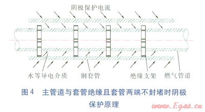 不可避免加設(shè)套管時(shí),套管兩端可不必密封防水材料,只要在主管道與套管之間充填柔軟材料防止沙石進(jìn)入對(duì)防腐層起破壞作用即可。因?yàn)楫?dāng)套管內(nèi)有水或泥土存在時(shí),能起到導(dǎo)電介質(zhì)的作用,陰極保護(hù)電流通過(guò)介質(zhì)形成回路,不會(huì)被屏蔽。套管可視為土壤介質(zhì)的一部分,陰極保護(hù)電流從套管外壁流入,從套管內(nèi)壁流出,再?gòu)闹鞴艿劳獠苛魅?,主管道將受到很好的陰極保護(hù)[2]。如果套管與主管道間有特定性能的電解質(zhì)物質(zhì),導(dǎo)電性能會(huì)更好,主管道陰極保護(hù)的效果會(huì)更好,其原理見(jiàn)圖4。