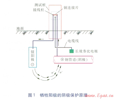 陰極保護(hù)分犧牲陽(yáng)極陰極保護(hù)法和外加電流陰極保護(hù)法。綠博公司主管道采用的是犧牲陽(yáng)極陰極保護(hù)法,其原理就是原電池的原理,是將一種比鐵更活潑的鎂陽(yáng)極與被保護(hù)的鋼管相連接,通過(guò)鎂陽(yáng)極的不斷氧化反應(yīng),向被保護(hù)的鋼管提供保護(hù)電子,使其獲得保護(hù)。犧牲陽(yáng)極陰極保護(hù)原理見(jiàn)圖l