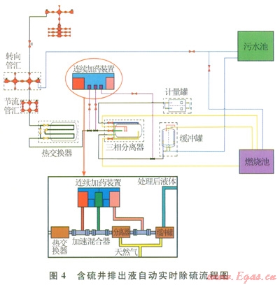 含硫井排出液自動實時處理技術主要采用物理和化學相結(jié)合的方法,對高含硫氣井測試期間排出液進行除硫、消泡和殘酸中和處理。該技術主要通過分離器、緩沖罐對流體中的氣體進行一級和二級物理分離,同時采用自動實時除硫裝置在流程中特定位置加注處理劑對產(chǎn)出流體進行化學處理,除硫劑等的優(yōu)選至關重要[13]。自動實時除硫裝置是該工藝技術得以成功實現(xiàn)的關鍵,其主要由注入系統(tǒng)、混合系統(tǒng)和監(jiān)測與控制系統(tǒng)組成,作業(yè)中通過實時監(jiān)測放噴出口大氣中H2S含量與污水池殘酸濃度,并及時反饋數(shù)據(jù)給自動實時除硫裝置PLC綜合控制系統(tǒng),由PLC自動控制向流程管線內(nèi)加注除硫劑、消泡劑、pH值調(diào)節(jié)劑,在密閉環(huán)境中進行除硫、消泡和殘酸中和。最終將處理后排放至污水池的流體pH值基本控制在6.4~7.8范圍,放噴出口大氣環(huán)境中H2S含量小于l4.4mg/m3,實現(xiàn)安全排放,保護現(xiàn)場作業(yè)環(huán)境。