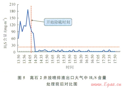 含硫井排出液自動實時處理流程(圖4)和]二藝技術目前已經(jīng)在川渝地區(qū)多口井開展應用,效果顯著(圖5),如高石2井在排液期間,采用該技術對井筒產(chǎn)出液進行處理前,放噴出口大氣環(huán)境中H2S含量主要維持在115~173mg/m3范圍內(nèi),而應用該技術后,放噴出口大氣環(huán)境中H2S含量降低到8.65mg/m3以內(nèi),可以滿足井場人員連續(xù)作業(yè)的要求。